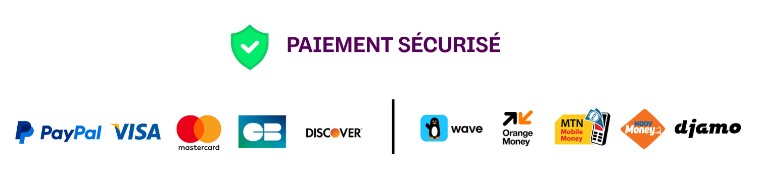 Les cartes internationales (Visa, Mastercard, Discover. etc.) mais aussi les mobile money & wallet disponibles dans + 20 pays africains (Wave, OM, MTN, Moov, Djamo...).